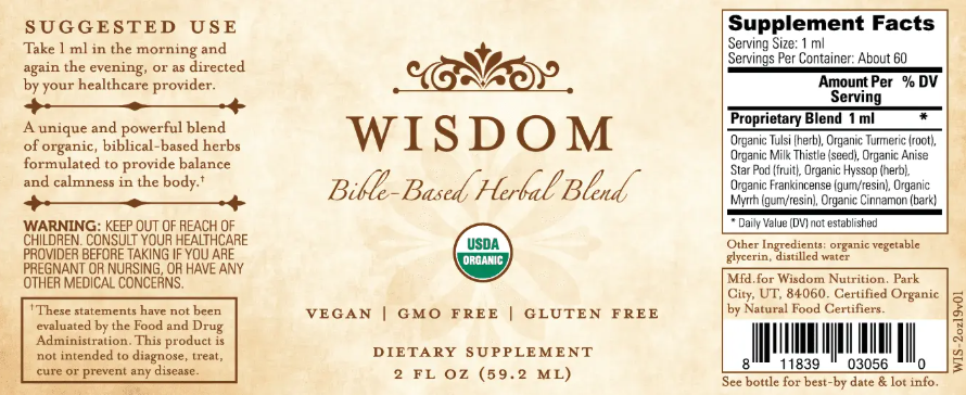 Wisdom Nutrition is a unique, Bible-inspired formula made from 100% organic, plant-based ingredients. It is carefully crafted in the USA in FDA-registered and GMP-certified facilities, using only advanced, high-precision manufacturing processes under the strictest safety and purity standards.